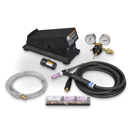 Complete TIG welding contractor kit designed for the Multimatic 215 PRO machine. This comprehensive package includes a Weldcraft A-150 TIG torch with Dinse-style connector for reliable arc initiation, a 14-pin wireless foot control for hands-free amperage adjustment, and a flow gauge regulator paired with 12 feet of gas hose for consistent shielding gas delivery. The AK2C torch accessory kit rounds out the setup with essential consumables and spare parts. Everything you need to start TIG welding right out of the box.